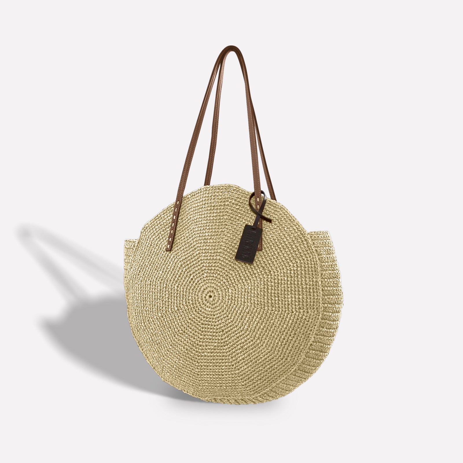Details: - Hand-crafted. - Material: 100% natural Raffia bag; real leather handle and embossed logo charm - Size: 15.5"h x 16.5"w- The set consists of 3 pieces. All bags are bundled...